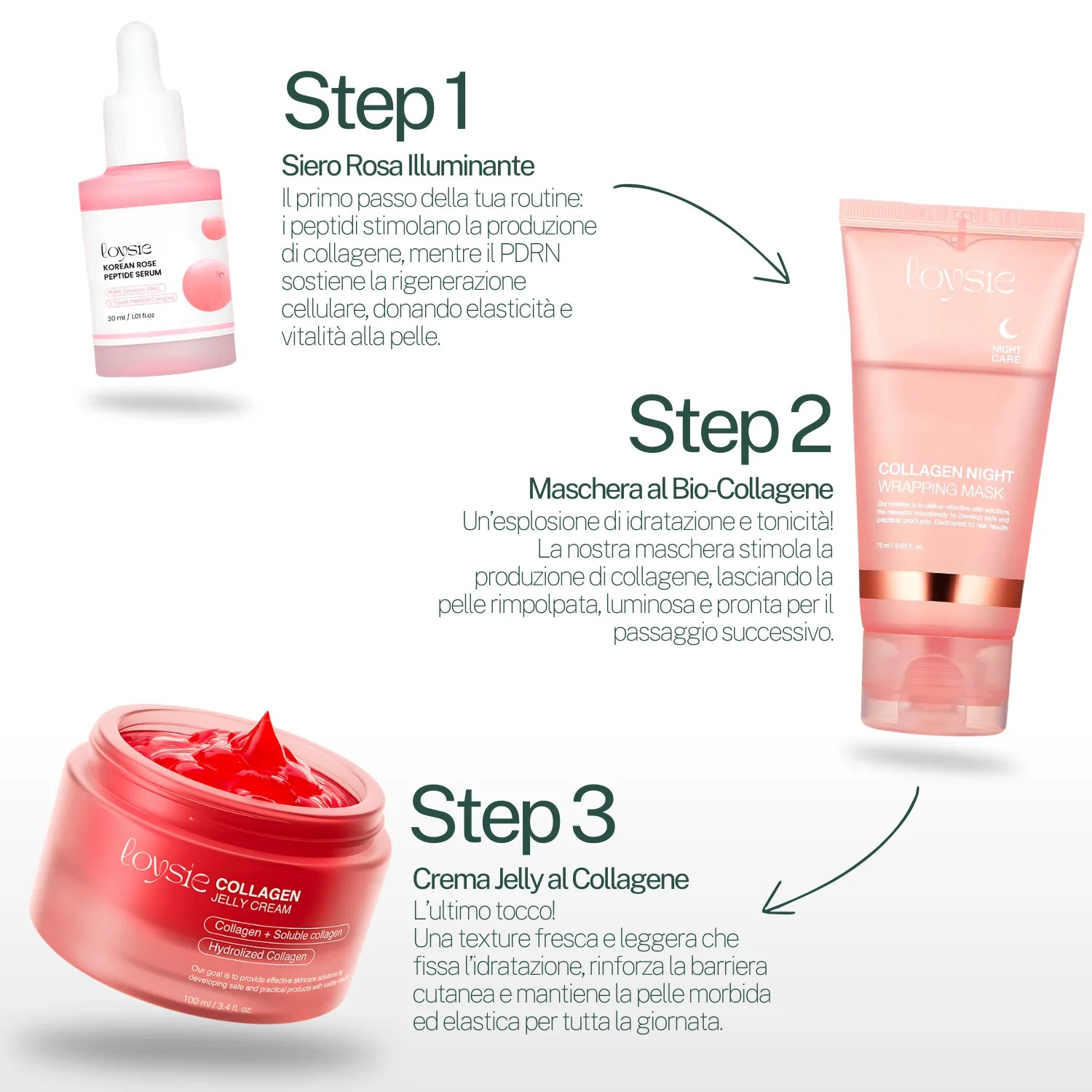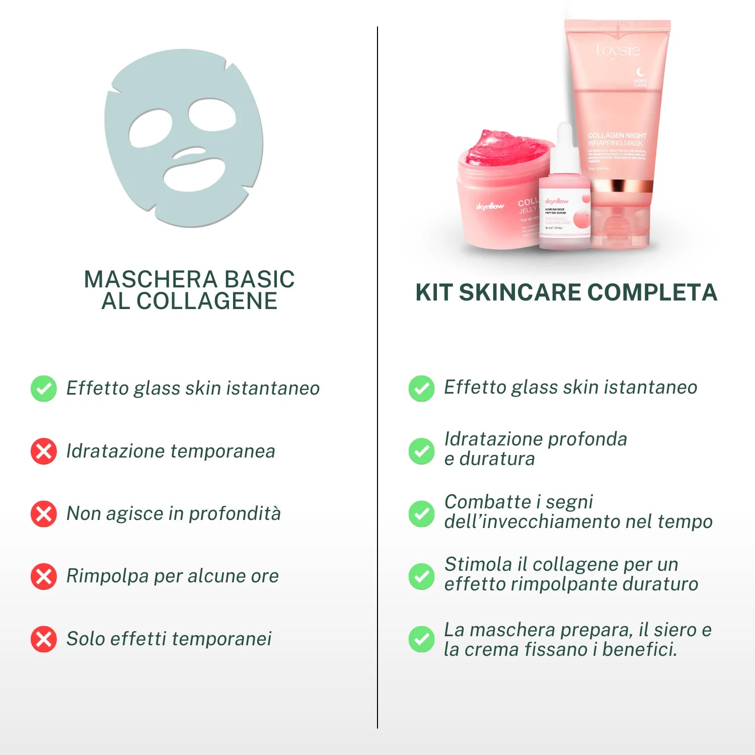 Il nostro Kit è progettato per regalarti il virale “Effetto Glass Skin” già dal primo utilizzo, mentre rassoda, leviga e perfeziona la pelle in 2 settimane, garantendo risultati duraturi.