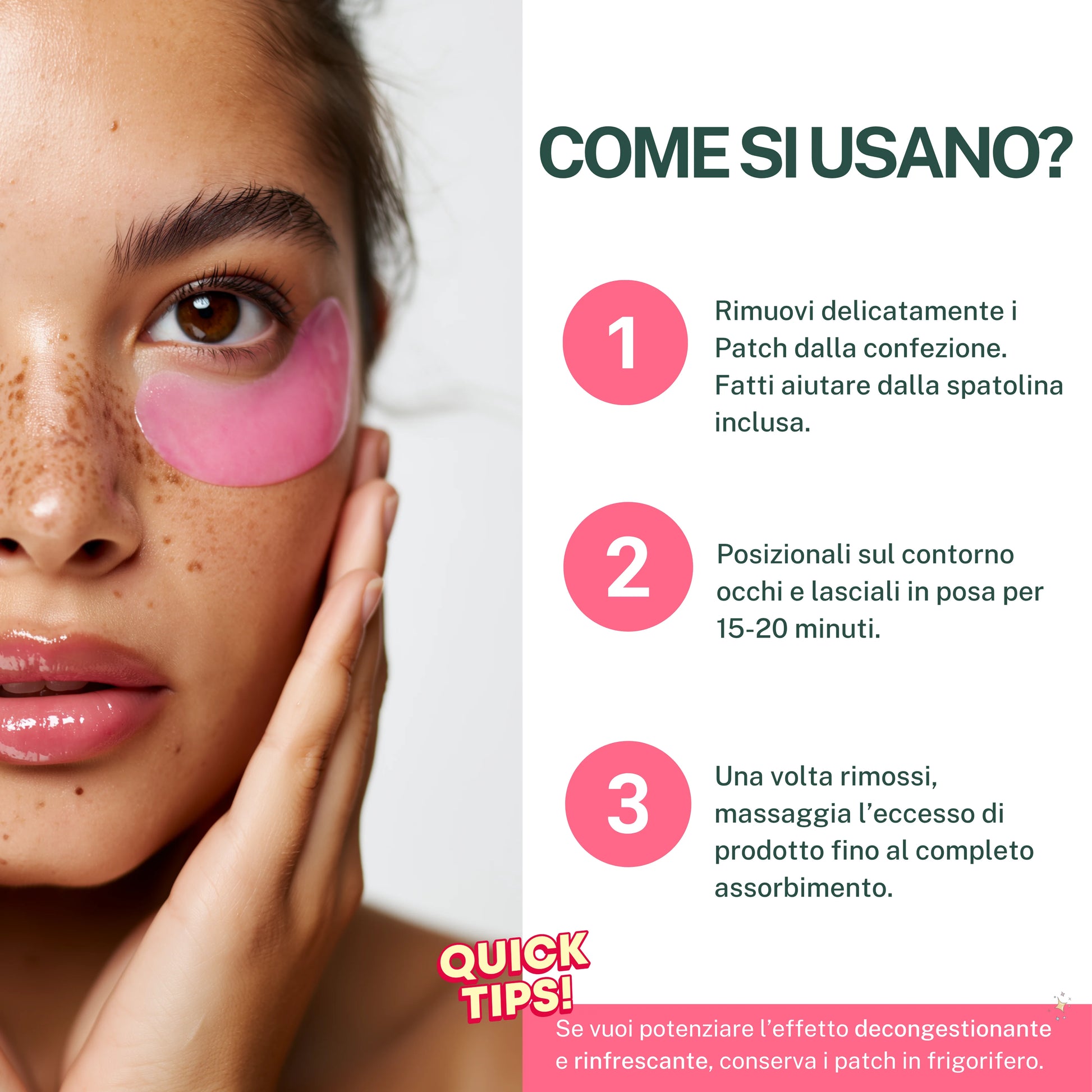 2. Posizionali sul contorno occhi e lascia agire per 15-20 minuti.